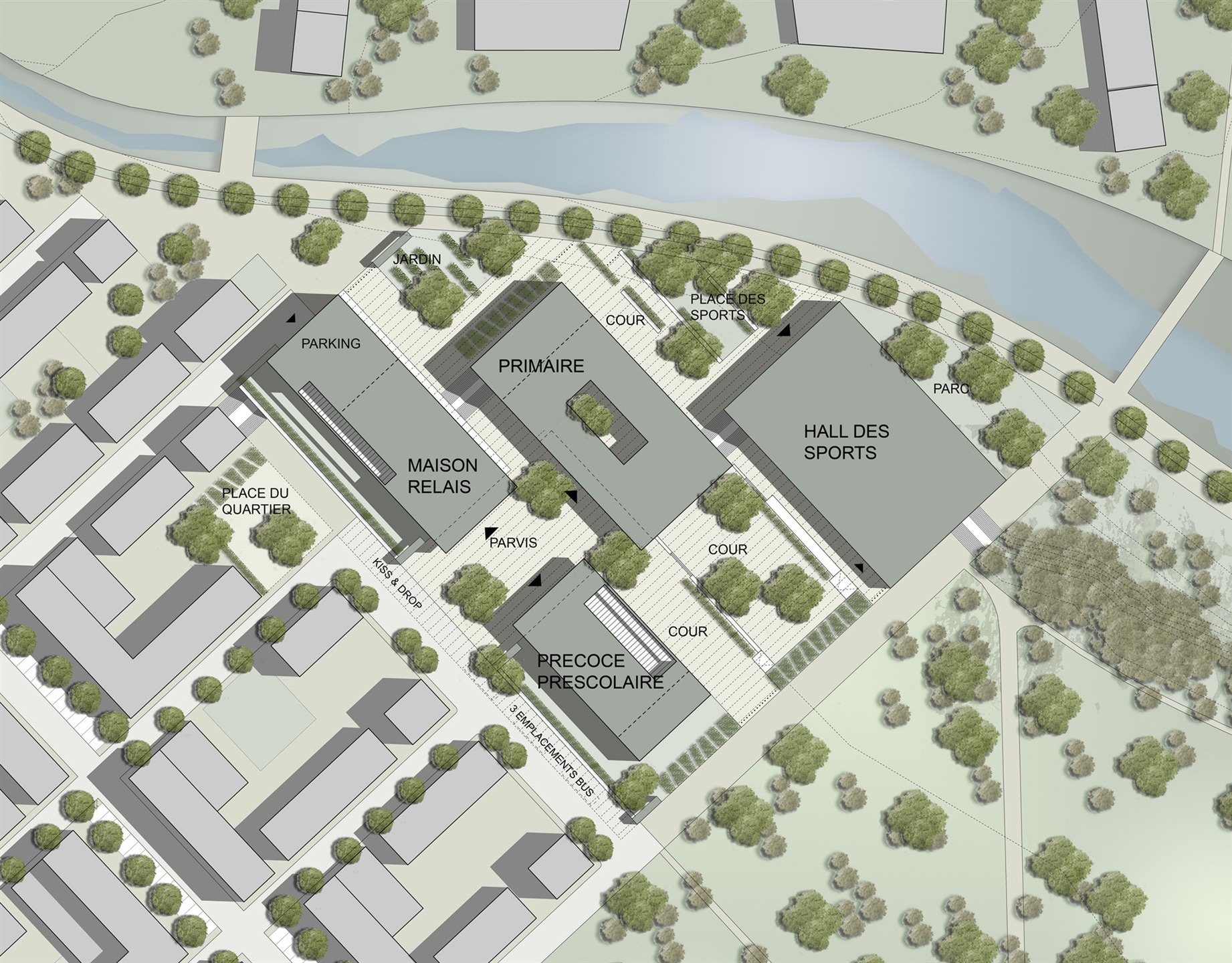 devant le bâtiment préscolaire et la maison relais une route transversale liaisonne les rues secondaires du quartier donnant accès au centre scolaire. cette voie offre suffisamment d’espace pour recueillir les bus scolaires et les voitures individuelles déposant les enfants. cette voie est complétée d’une part par une place de quartier ancrée dans le tissu du quartier et de l’autre par une place, plaque tournante dans le tissu scolaire. le bâtiment préscolaire et la maison relais s’écartent au centre pour s’orienter avec leurs accès sur le parvis des écoles qui en son fond donne accès à l’école primaire. les espaces ménagés entre les bâtiments scolaires offrent des passages secondaires pour joindre le parc à la place située au nord devant le cipa. la salle des sports semi enterrée le long du parc est accessible de plain pied en son niveau supérieur pour les spectateurs et de même pour les sportifs en son niveau inférieur. le parking en surface et le parking souterrain sous la maison relais sont accessibles par la pente naturelle de la rue desservante sans l’aménagement d’une rampe supplémentaire.